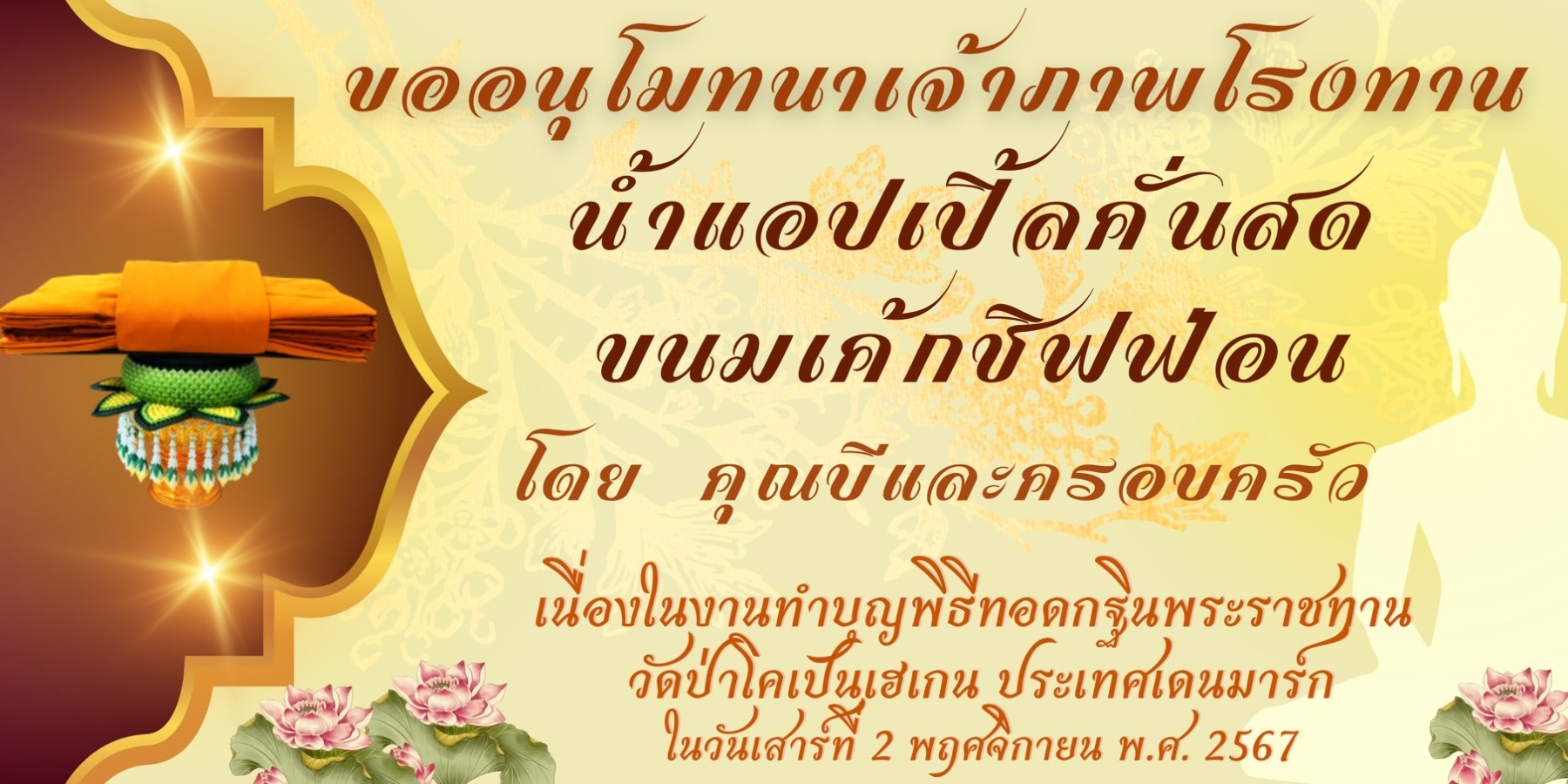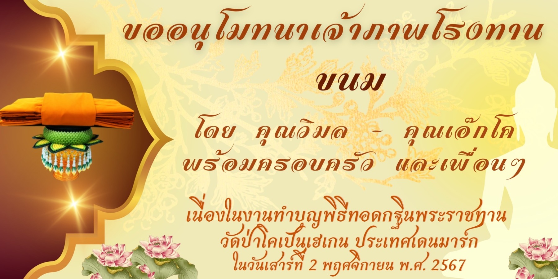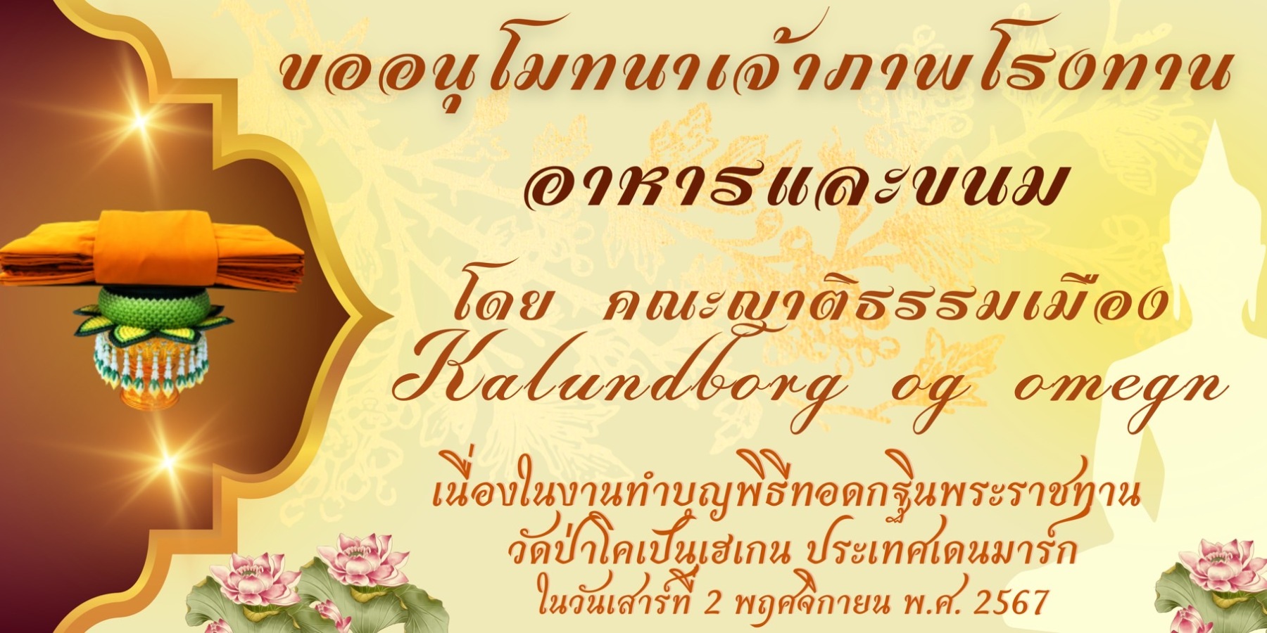 ดังนั้นวัดป่าโคเปนเฮเกนจึงแจ้งข่าวอันเป็นมงคลนี้ให้ท่านทั้งหลายได้รับรู้ เพื่อที่จะได้ร่วมกันทำบุญ ตักบาตร ถวายทาน และสร้างบุญกุศลโดยเพื่อร่วมพระราชกุศลกับองค์ในหลวงของเรา ด้วยการร่วมบุญถวายผ้าพระกฐินพระราชทานในครั้งนี้โดยพร้อมเพรียงกัน