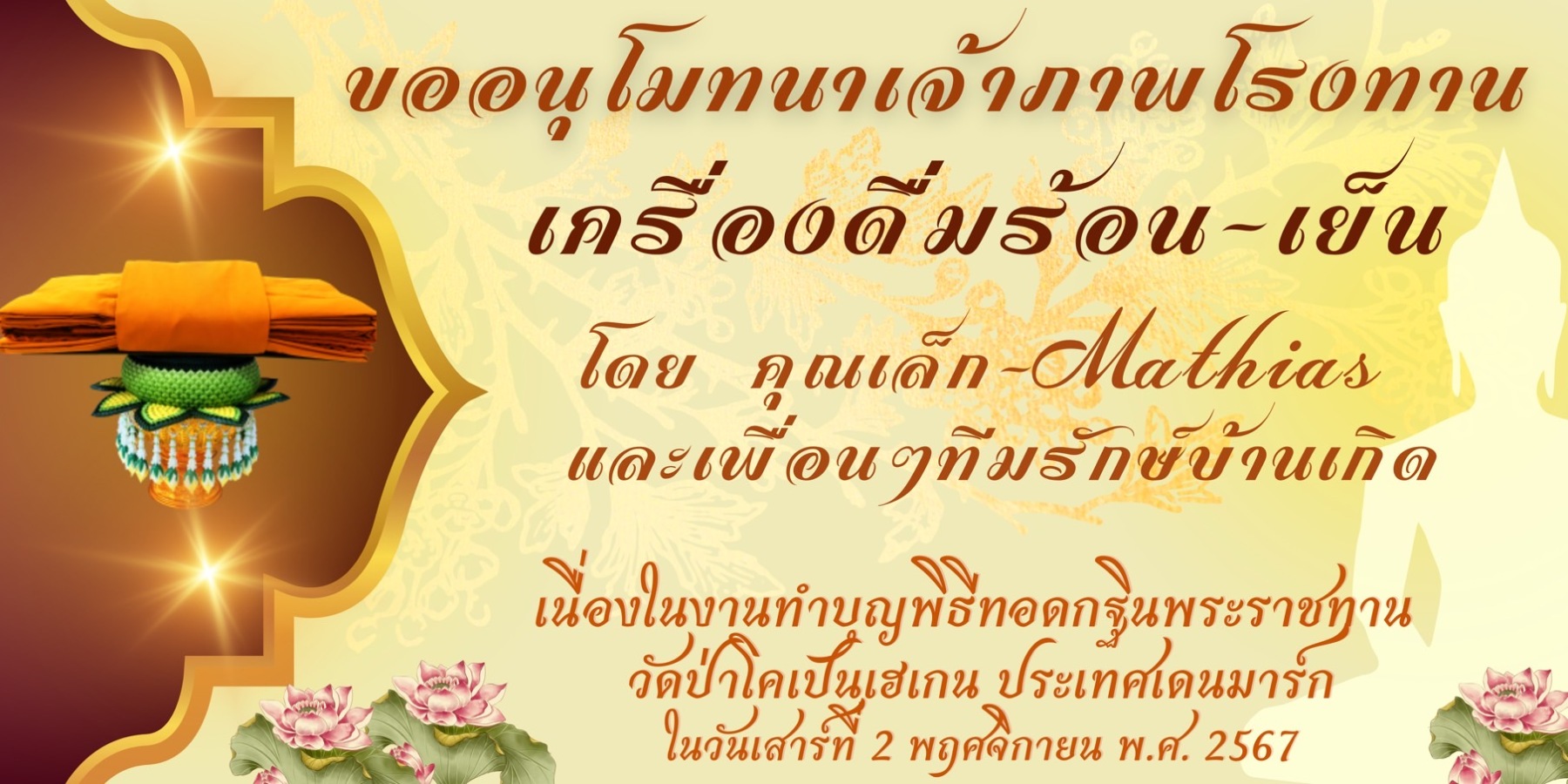ในพรรษากาลนี้ ได้รับพระมหากรุณาธิคุณเป็นล้นพ้น จากพระบาทสมเด็จพระเจ้าอยู่หัวฯ ทรงพระกรุณาโปรดเกล้าฯ พระราชทานผ้าพระกฐิน เพื่อนำมาถวาย ณ วัดป่าโคเปนเฮเกน นับว่าเป็นสิ่งที่น่ายินดีเป็นอย่างยิ่ง ซึ่งจะมีพิธีถวายผ้าพระกฐินพระราชทานขึ้นในวันเสาร์ที่ ๒ พฤศจิกายน ๒๕๖๗